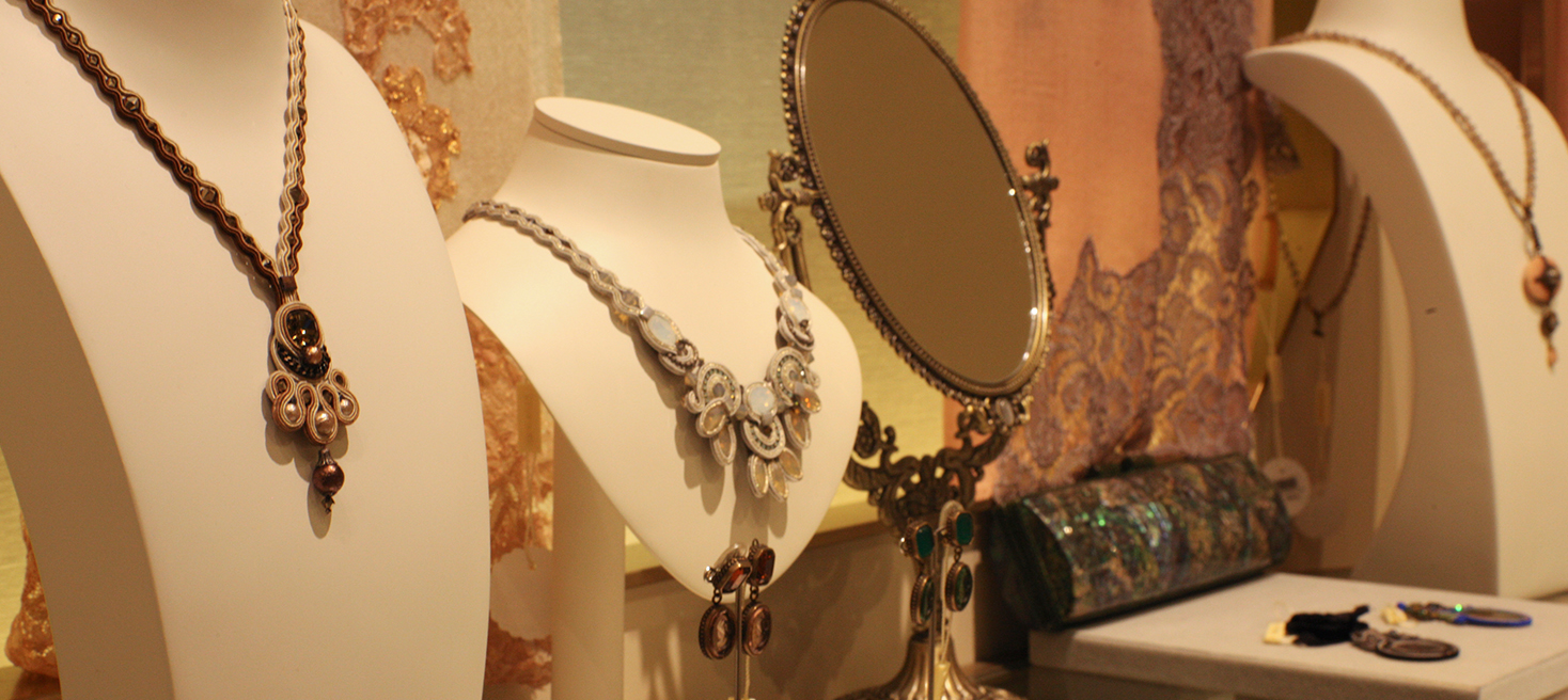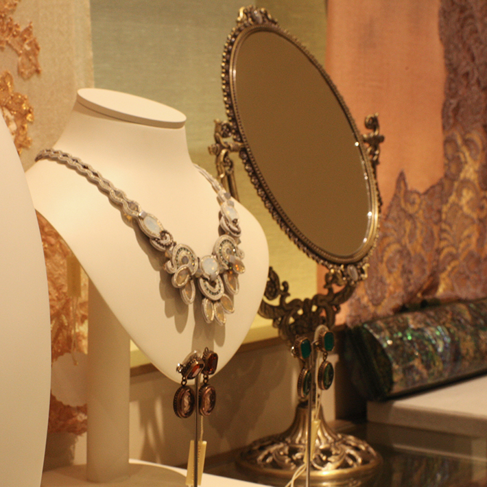 饰品多由欧洲引进,款式多样,它包含有项链、围巾、包包、帽子、头饰、鞋等,选材上乘,运用真丝、羊绒、水晶、珍珠等高档材质。采用不同气质的设计手法,无论是现代简约风格,古典奢华风格,浪漫主义风格,都能满足您的搭配需求。